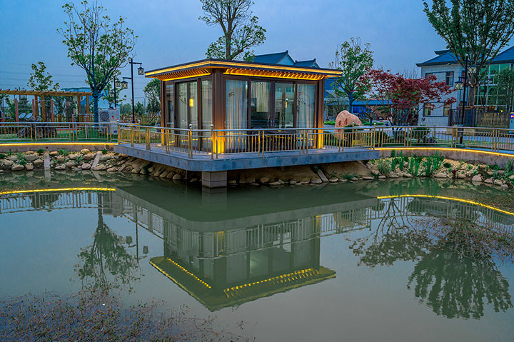 - 產(chǎn)品寓意在時光中尋覓歲月流逝的痕跡,將其中的精華萃取并匯聚于涼亭的藝術(shù)之中,當(dāng)傳統(tǒng)遇上新潮,當(dāng)古典遇上現(xiàn)代,無錫風(fēng)憬花園,用簡約的方式還原時光的面貌,疏而不空,滿而不溢。池塘月色,孤影亭亭玉立映成雙。